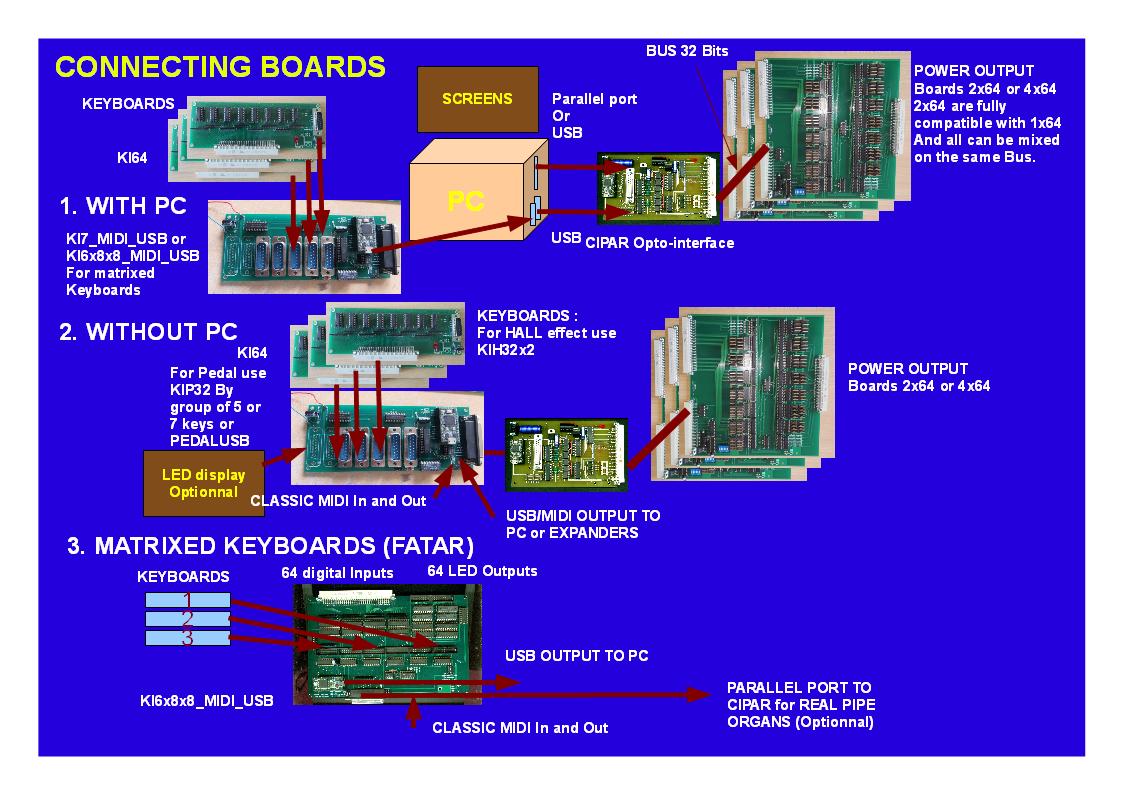 TO CONNECT BOARDSINPUT CARDS For classic contacts or HALL sensors KI7_MIDI_USB KI64 for classic contacts KLI64OPTO KIH32 for HALL Sensors FOR MATRIXED KEYBOARDS KI6x8x8_MIDI_USB KI8x8x8_MIDI_USB ____________________ PEDALBOARDS : PEDUSB ____________________ PIPE ORGAN OUTPUT CARDS CIPAR Interface O2x64 Outputs O4x64 Outputs ____________________ MAGNET VALVES Kevin Wang Magnets Low cost Chinese Magnets ____________________ WITH or WITHOUT PC __________________ VIRTUAL ORGANS SOFTWARE MY REAL PIPE ORGAN VIRTUAL VERSUS REAL : A false problem |